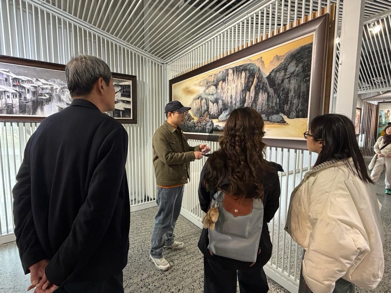 调研期间,军声砂石画馆馆长孔菁萍对学院教师一行的到来表示热烈欢迎,详细介绍了画馆的发展历程、经营现状及人才需求痛点。作为张家界文化产业的一张特色名片,军声砂石画馆深耕本土文化传播,将张家界的奇山秀水与民俗风情融入砂石画创作,凭借独特的艺术魅力吸引了大量国际游客。孔馆长介绍,画馆去年全年接待国外游客超40万名,其中韩国游客占比达一半以上,高达20余万名,成为韩国游客了解张家界文化的重要窗口。