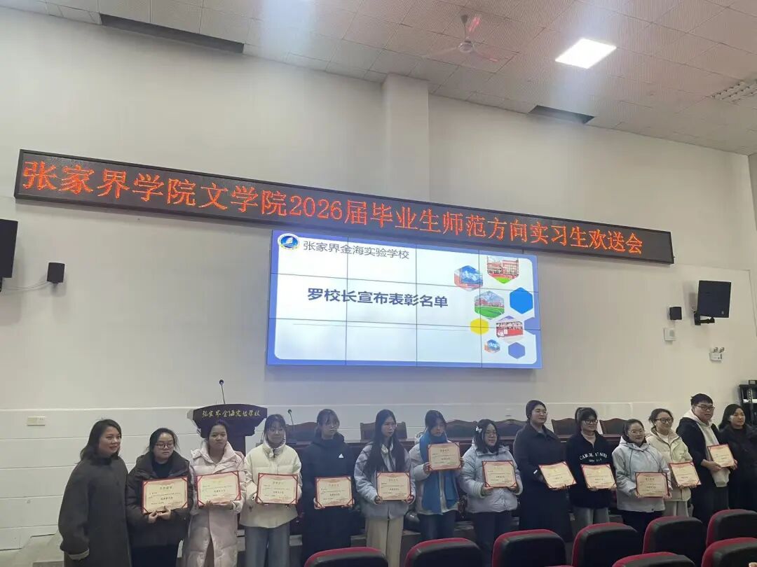 近日,文学院英语专业与汉语言专业实习生在金海学校的师范实习工作圆满收官,一场温馨满满的欢送会如期举行。学院胡婕、袁晓丹两位指导老师受邀出席,与全体实习生齐聚一堂,共同定格这段充实的实习时光。