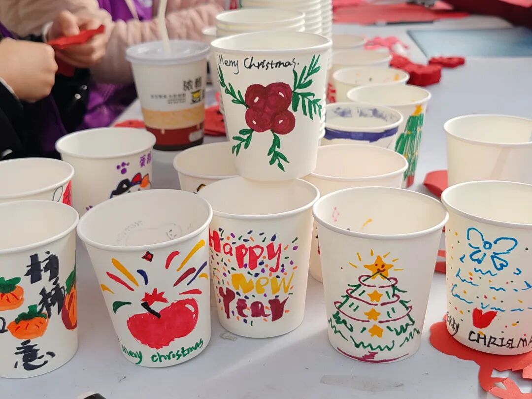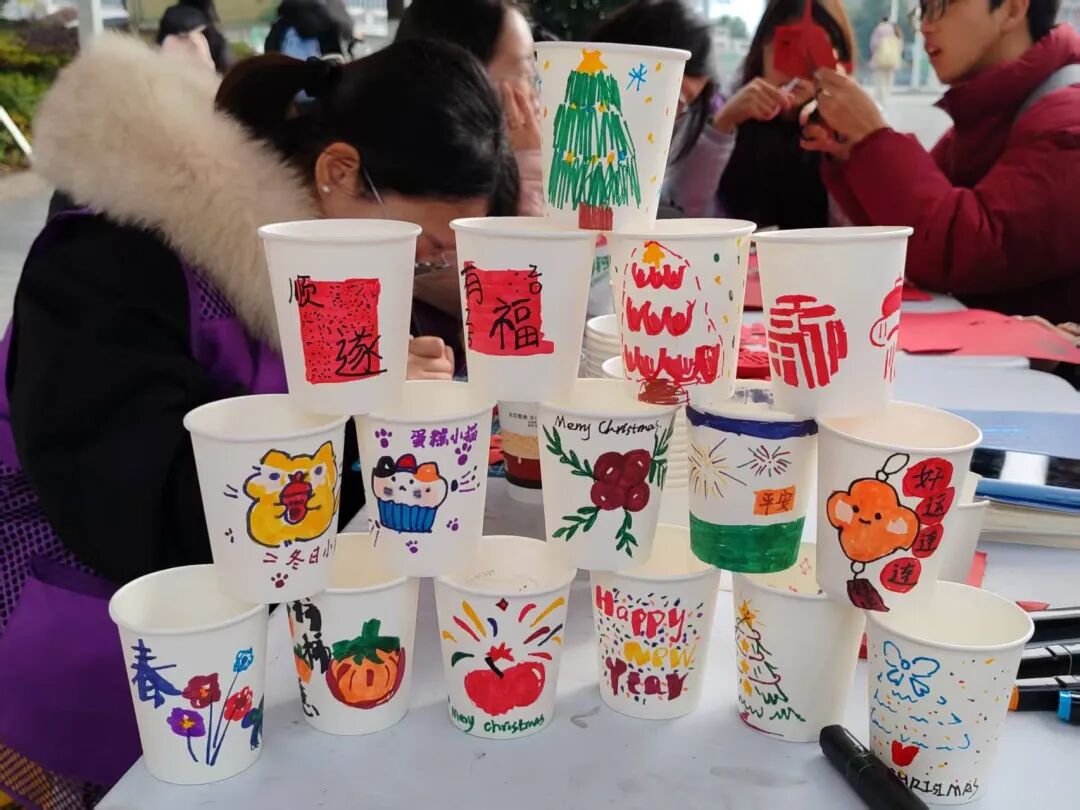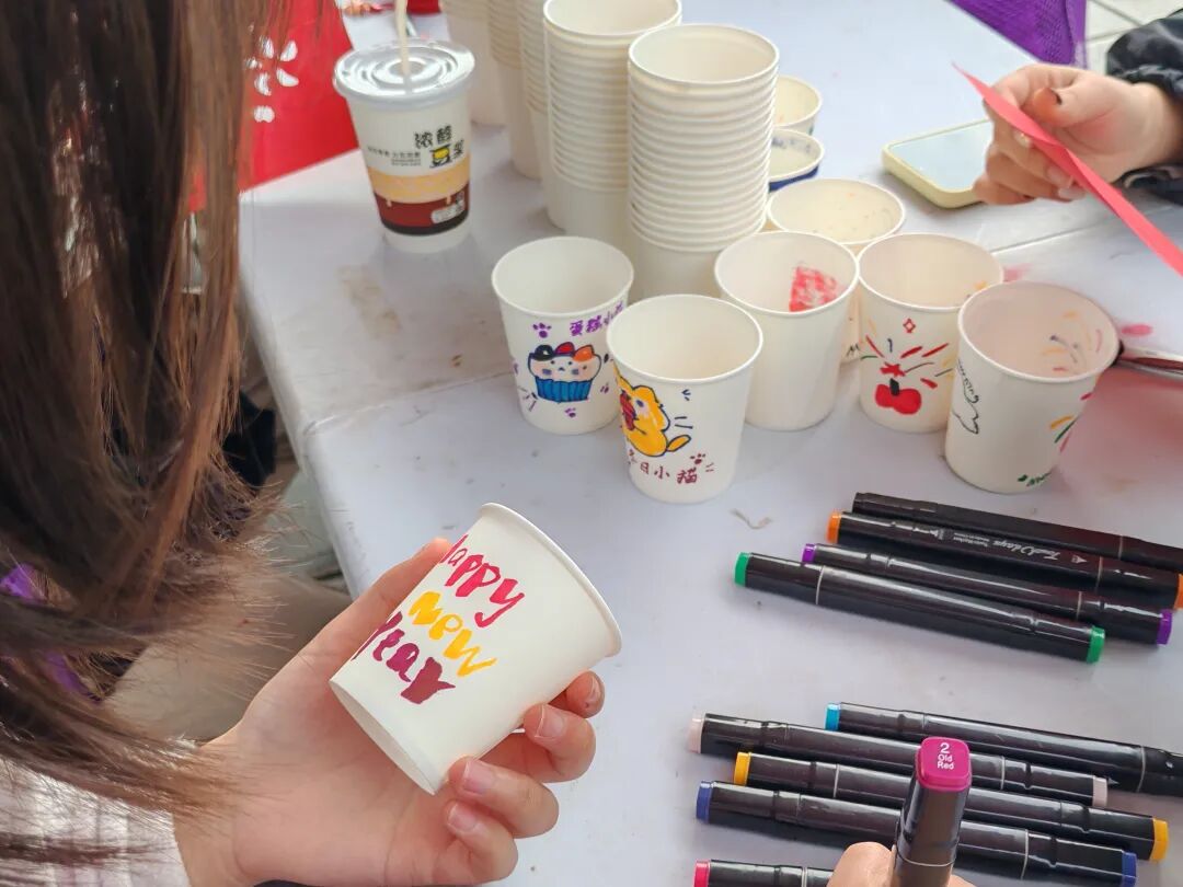 活动现场,志愿者们提前准备好纯白纸杯、马克笔等创作材料。同学们围绕纸杯展开创意构思,以笔为媒,将吉祥祝福、萌趣图案、暖心寄语等元素绘于杯身,普通的纸杯在大家的巧手下变成了独具个性的文创作品。有的绘出“心想事橙”的趣味图案,有的写下温馨的节日祝福,还有的勾勒出灵动的花草纹样,每一个纸杯都承载着同学们的巧思与创意。